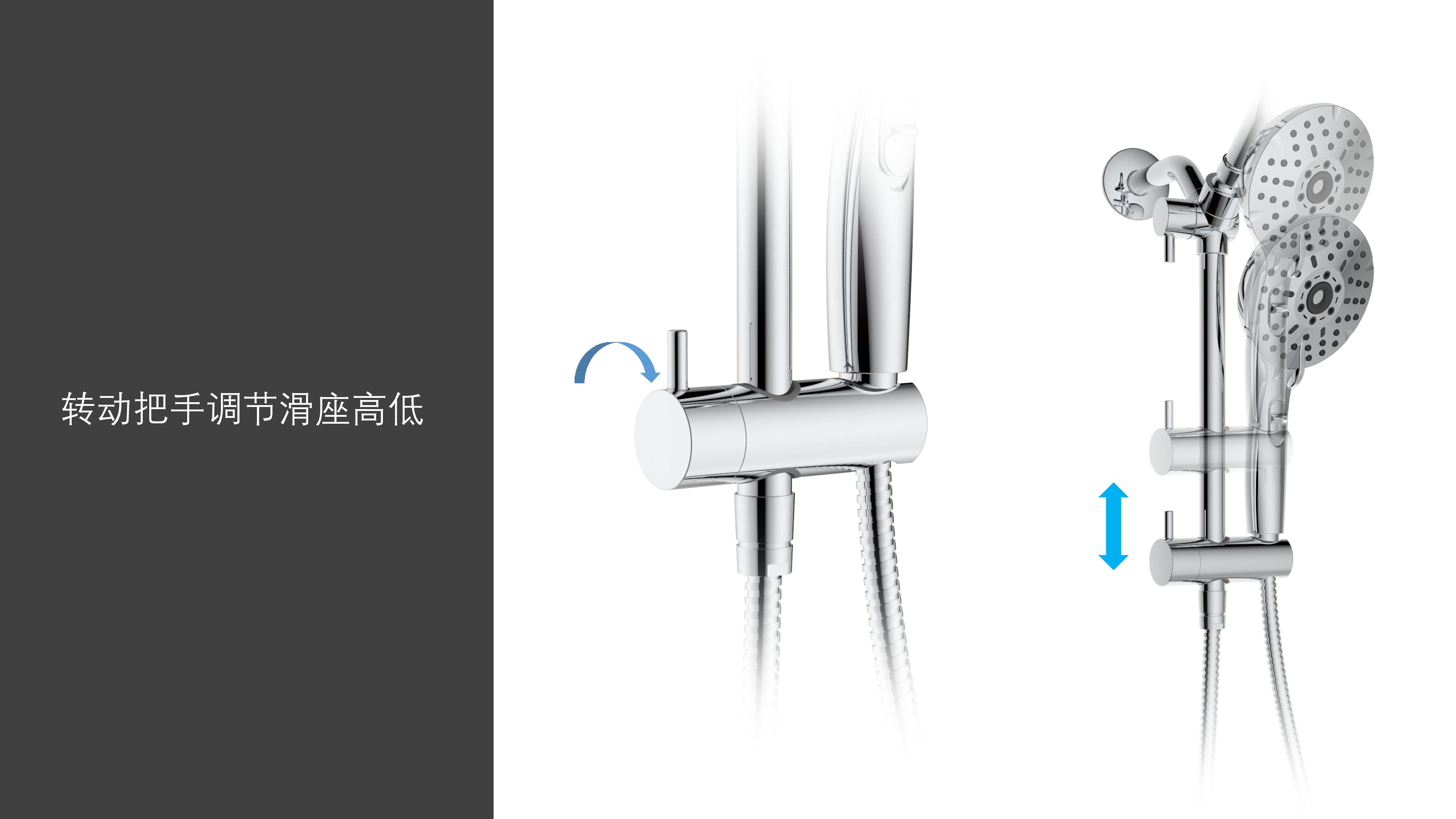 上出水彎管套裝;頂噴內(nèi)置球頭,可實現(xiàn)多角度旋轉(zhuǎn)調(diào)整;把手切換頂噴出水、花灑出水;轉(zhuǎn)動把手調(diào)節(jié)滑座高低;5功能出水花灑