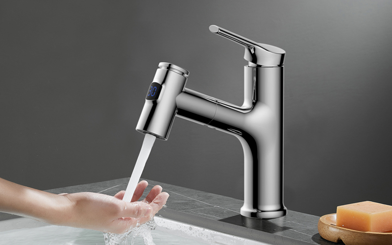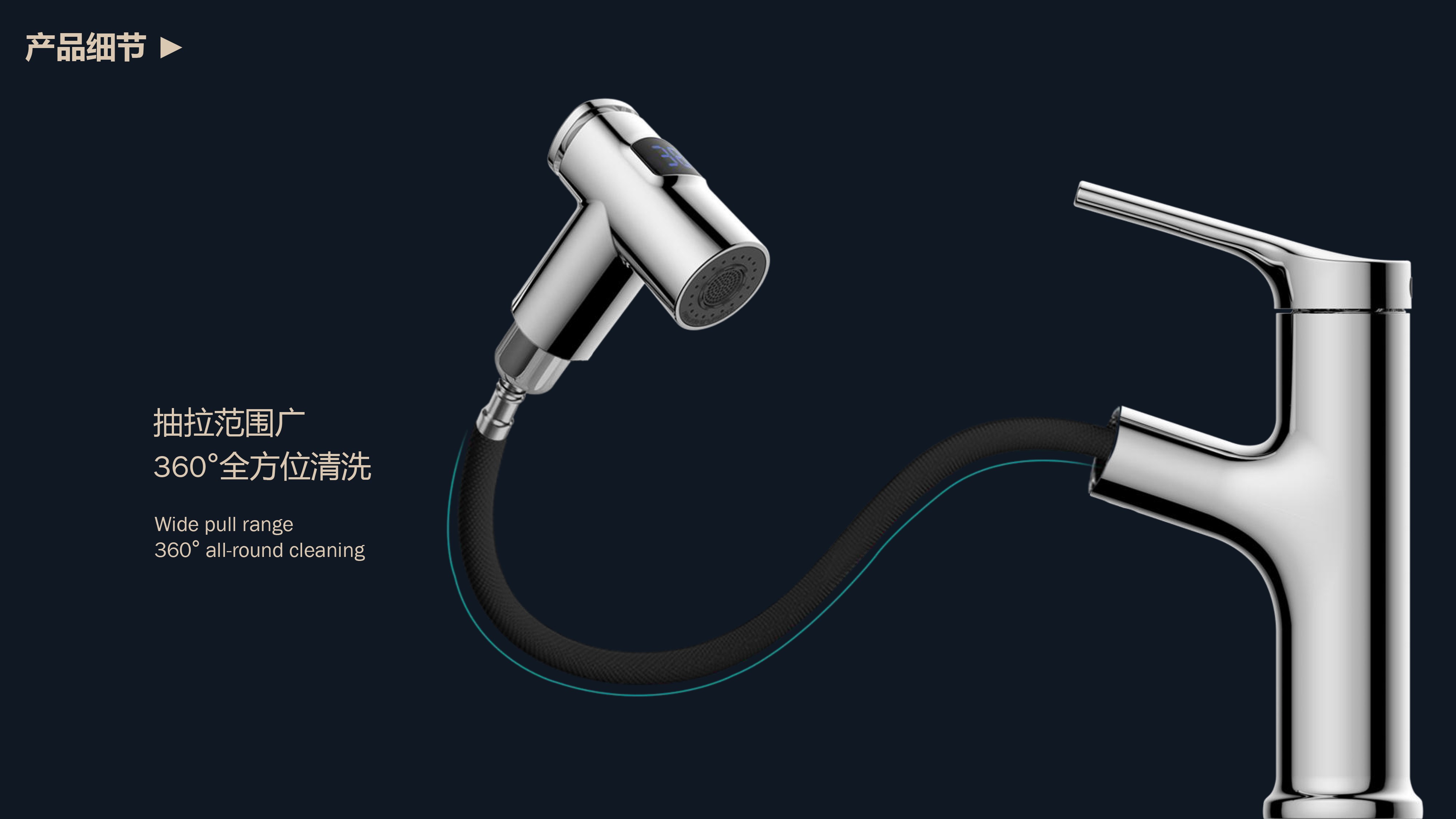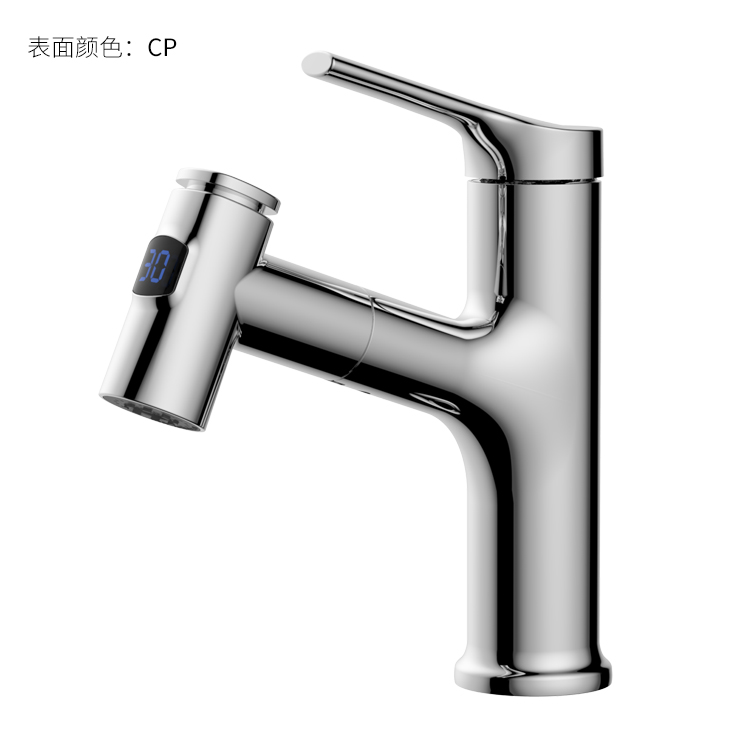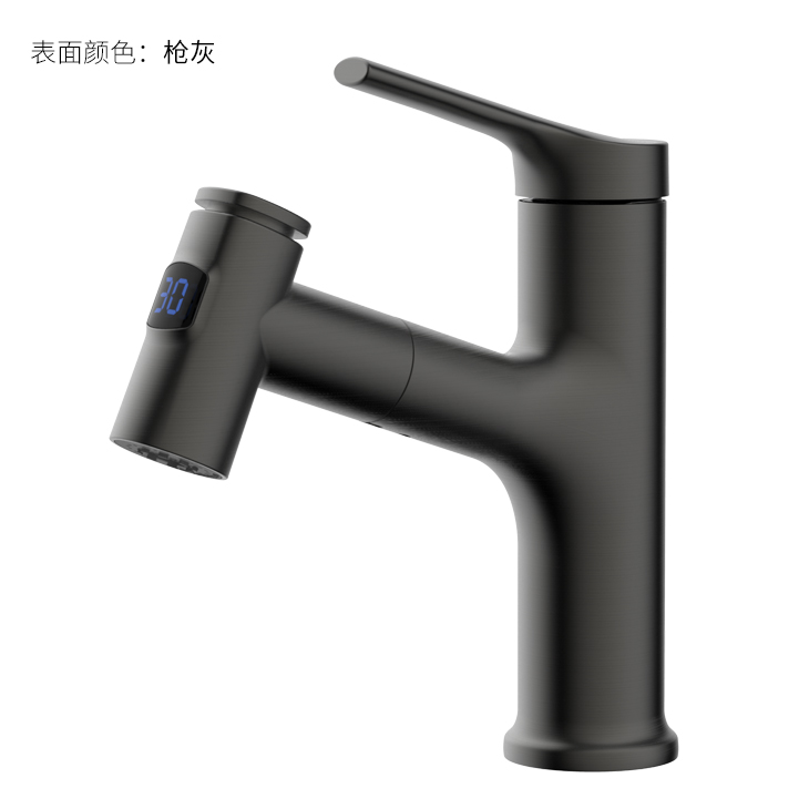 數(shù)顯面盆抽拉龍頭,解鎖龍頭舒適用法;360°全方位清洗;日常洗頭利器,抽拉出水輕松洗;按壓切換兩功能水花抽拉頭;出水溫度實時看得見,安全防燙