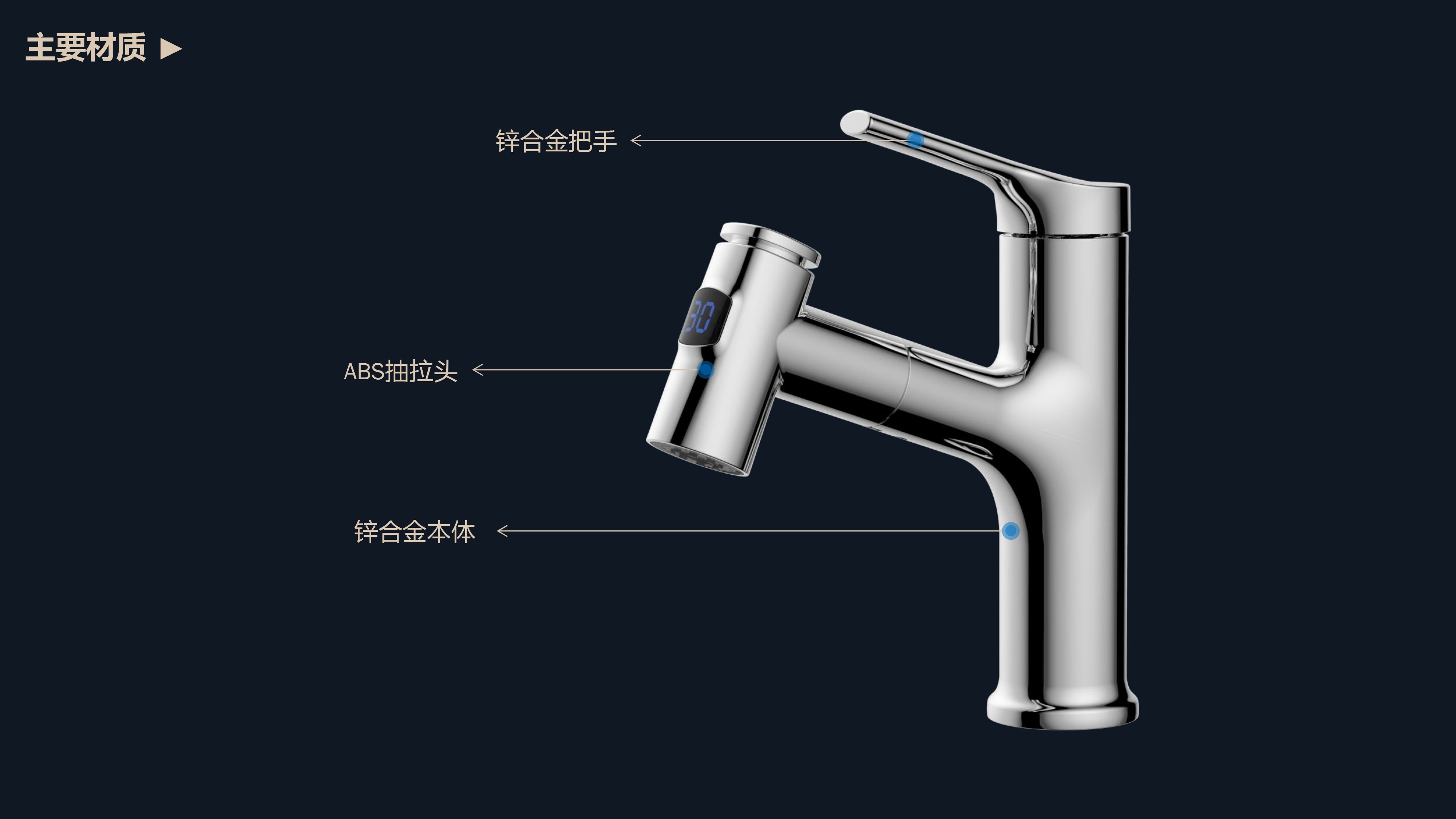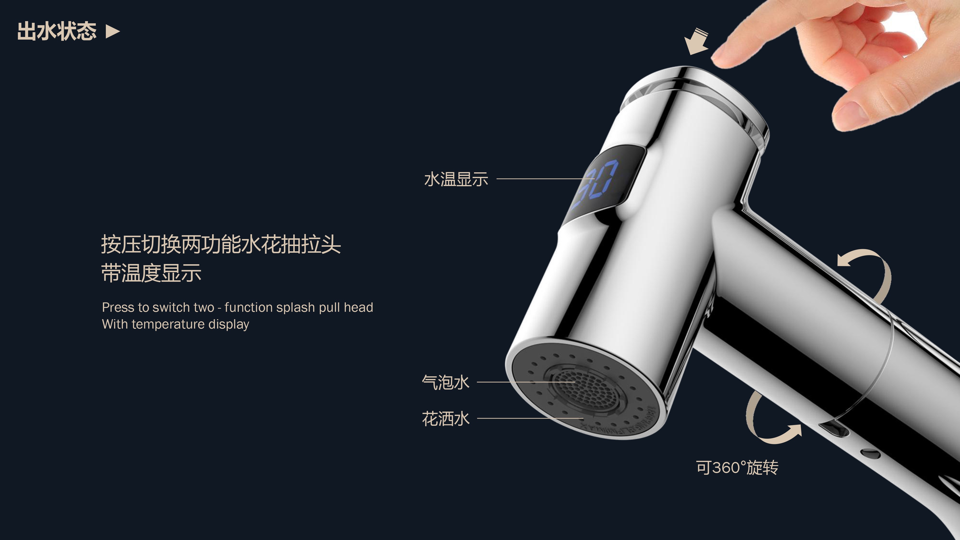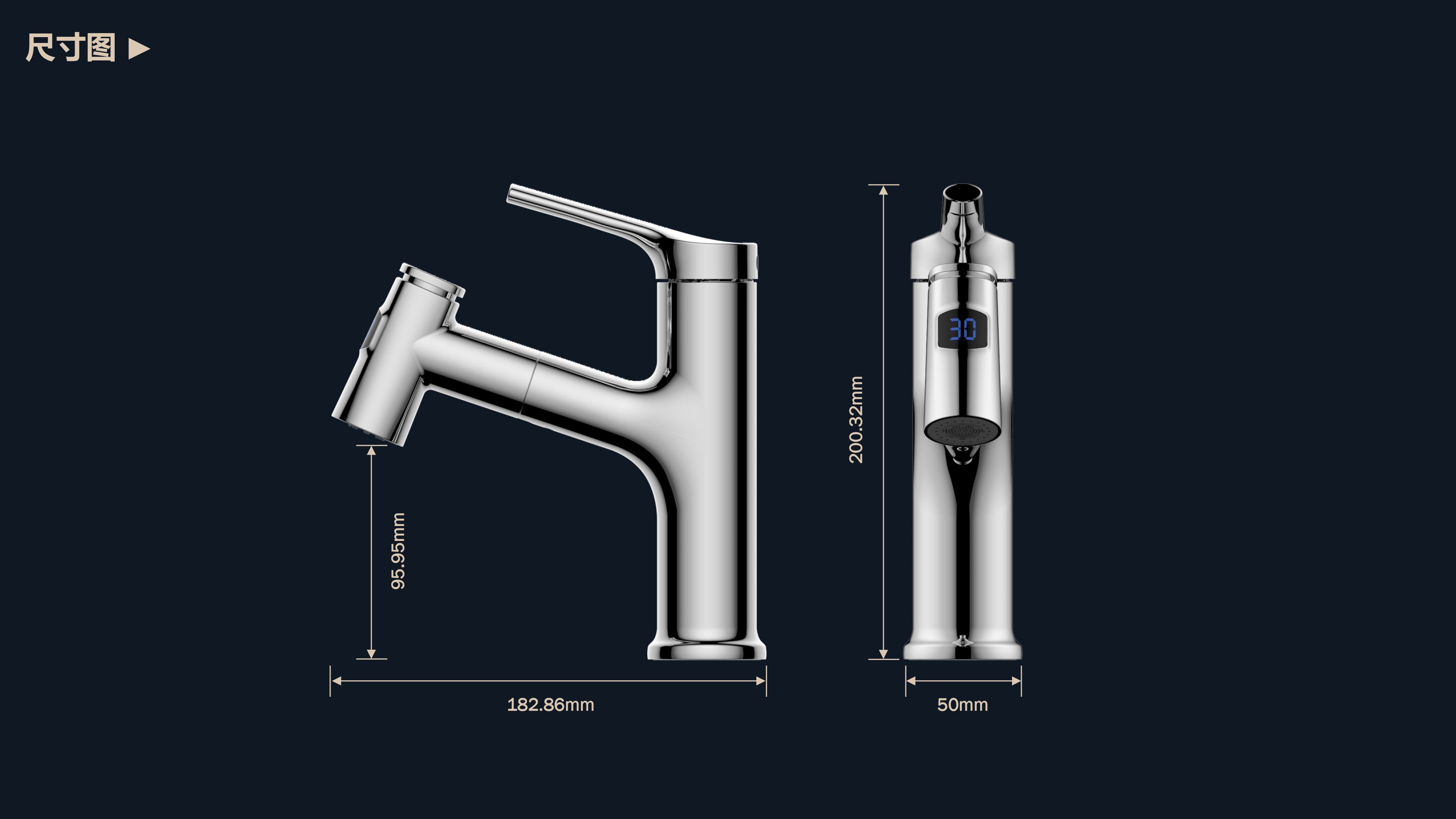 數(shù)顯面盆抽拉龍頭,解鎖龍頭舒適用法;360°全方位清洗;日常洗頭利器,抽拉出水輕松洗;按壓切換兩功能水花抽拉頭;出水溫度實時看得見,安全防燙
