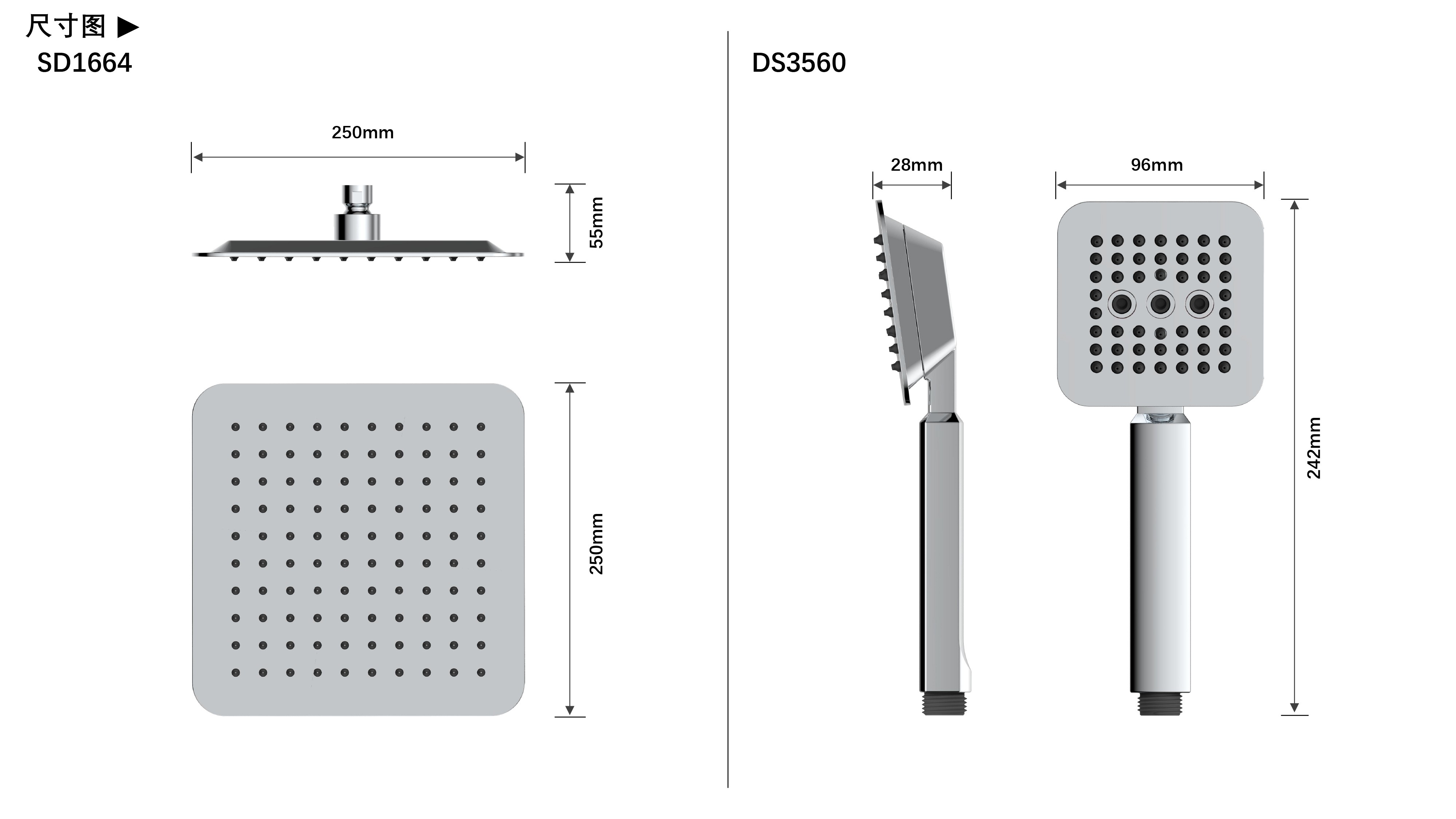 方形寬大頂噴;Z字形三通;按壓切換頂噴/花灑出水